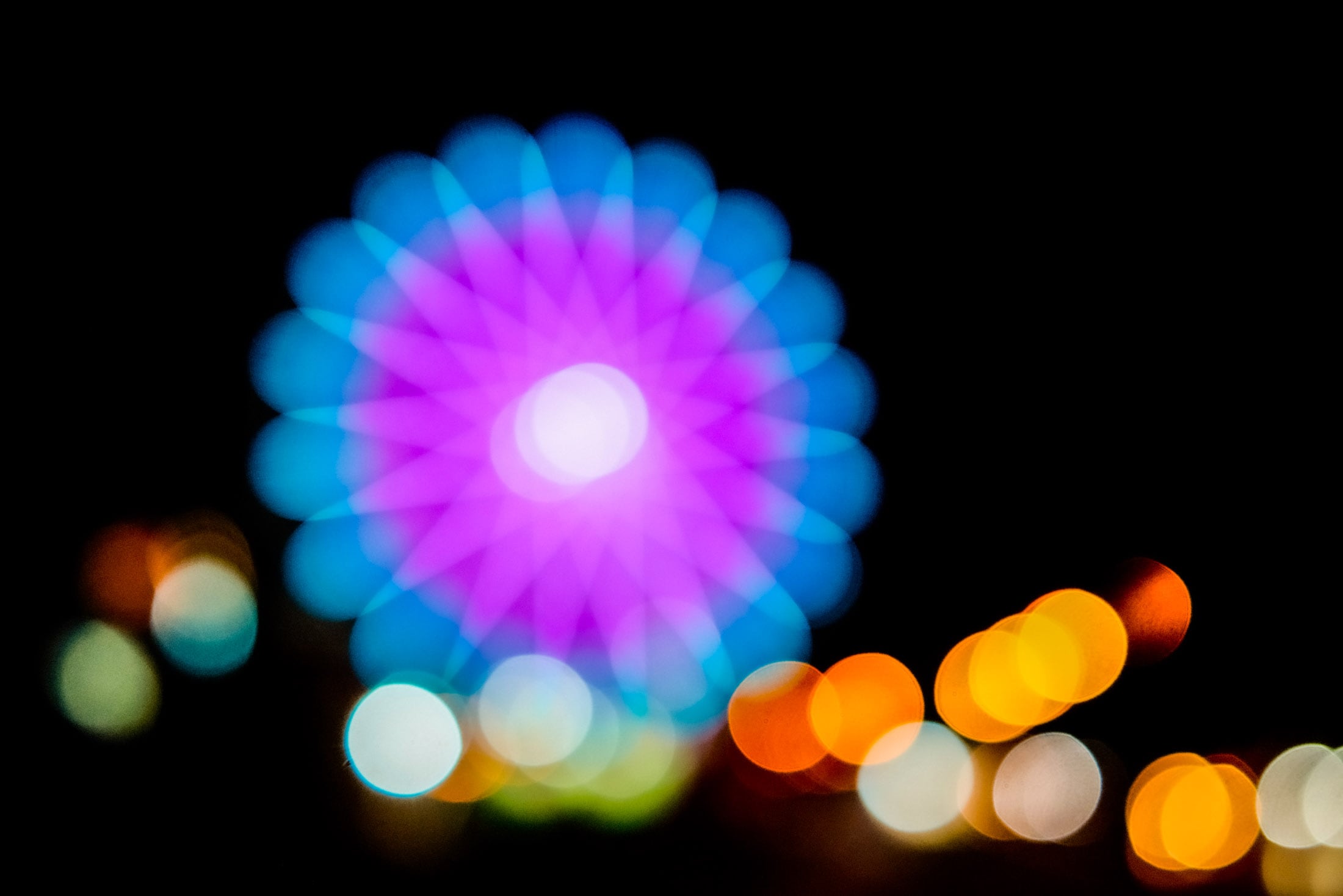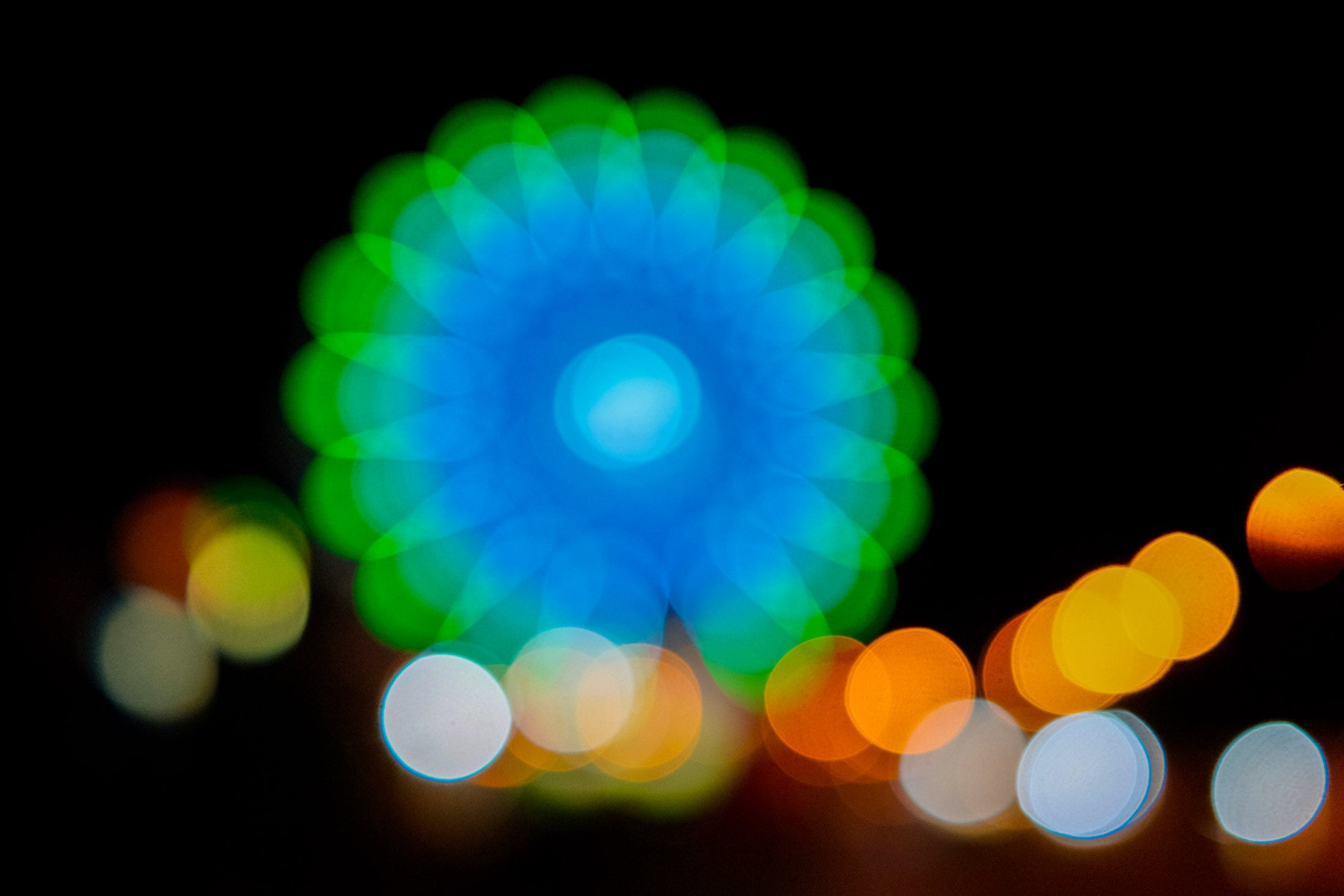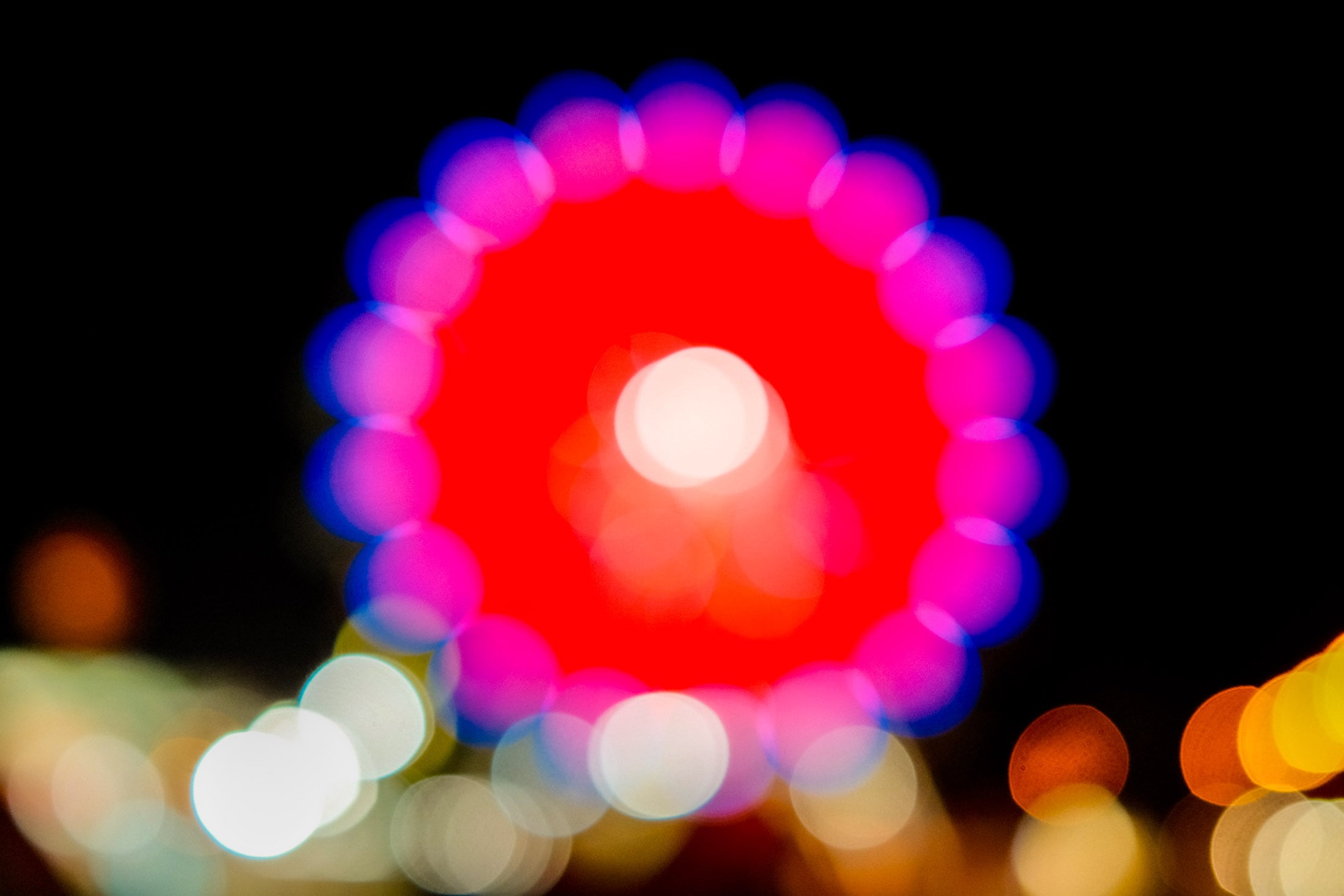 Die Beleuchtung des Riesenrades eignet sich hervorragend um schöne abstrakte Bokeh-Desktophintergründe zu fotografieren. Einfach den manuellen Fokus aktivieren und auf die maximale Naheinstellgrenze fokussieren. Schon bekommst du ein wunderbares Bokeh.